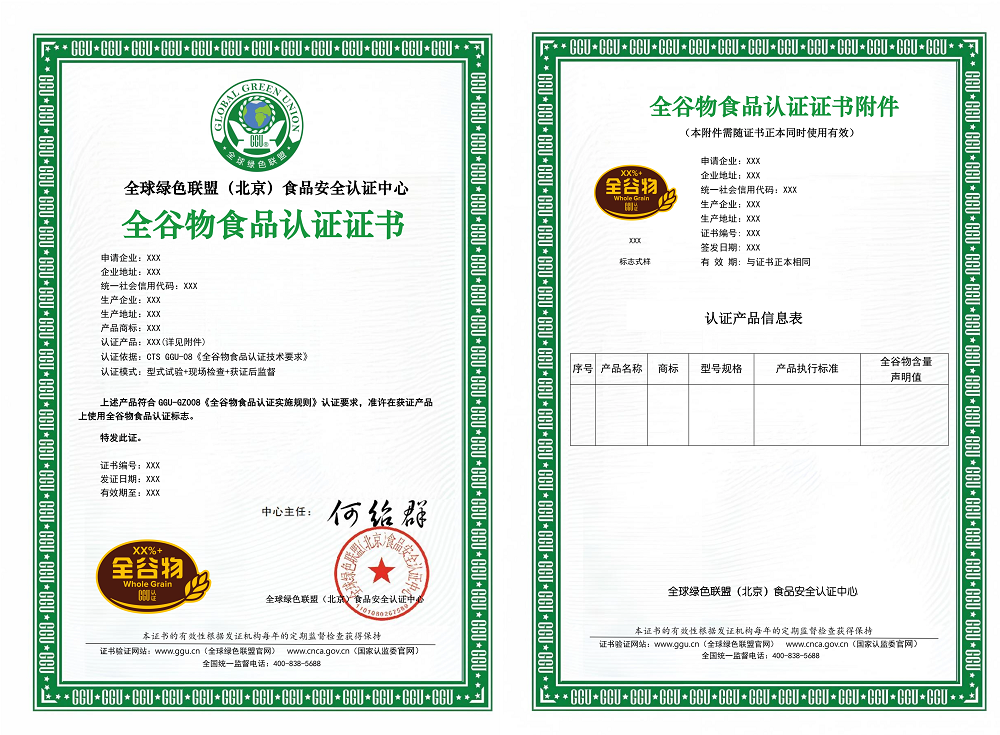 1.实施规则名称及编号:GGU-GZ008-2024《全谷物食品认证实施规则》